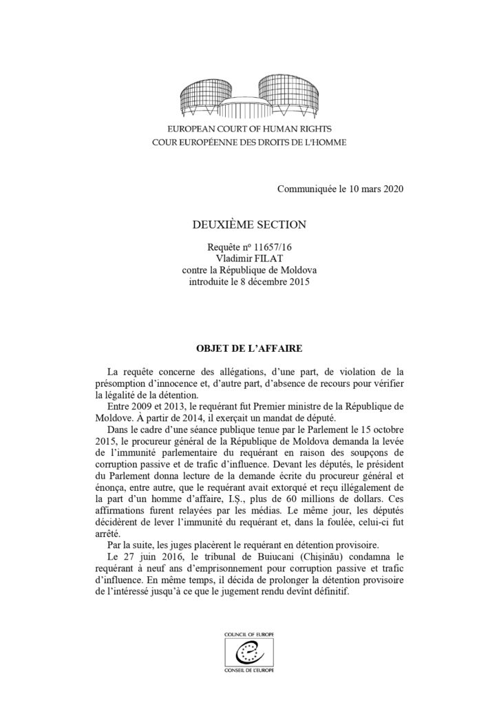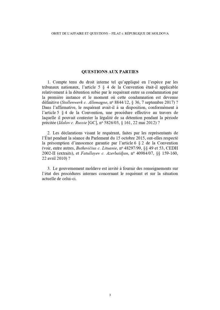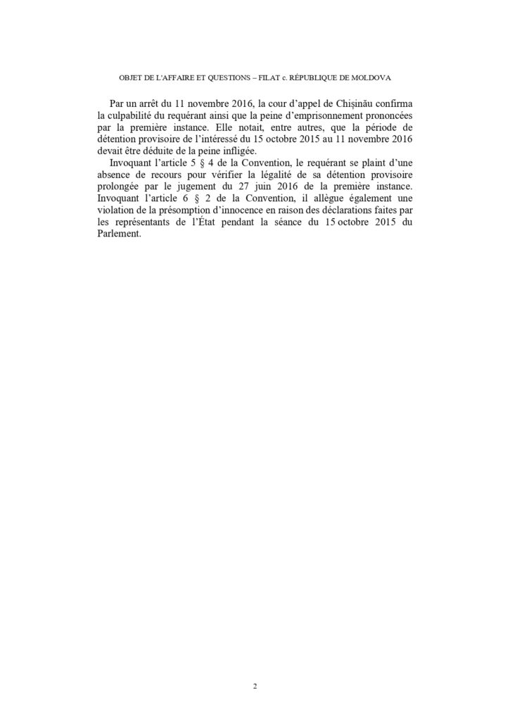 În particular, CtEDO a solicitat ca Guvernul Republicii Moldova să dea explicații, în special la faptul în ce măsură declarațiile făcute de către reprezentanții statului în cadrul ședinței Parlamentului din 15 octombrie 2015 (atunci când am fost lipsit de imunitate parlamentară și, ulterior, reținut de procurorii anticorupție) au respectat prezumția de nevinovăție, garantată de art. 6 par. 2 din CEDO.